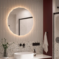 Modernes rundes Spiegel mit unregelmäßiger Oberfläche, das durch seine Einzigartigkeit begeistert. Die subtile LED-Hinterbeleuchtung hinter dem Spiegel verleiht dem Raum mehr Tiefe. Es passt perfekt zu Designer-Einrichtungen, und sein raues, aber elegantes Finish betont die Schönheit natürlicher Materialien. Dieser Spiegel ist nicht nur ein funktionales Element, sondern auch ein echtes Schmuckstück.