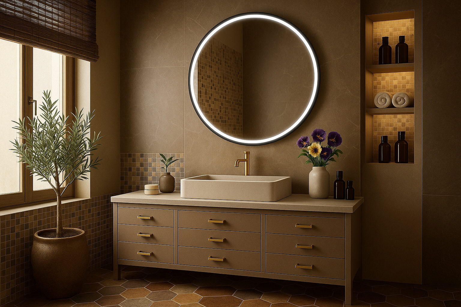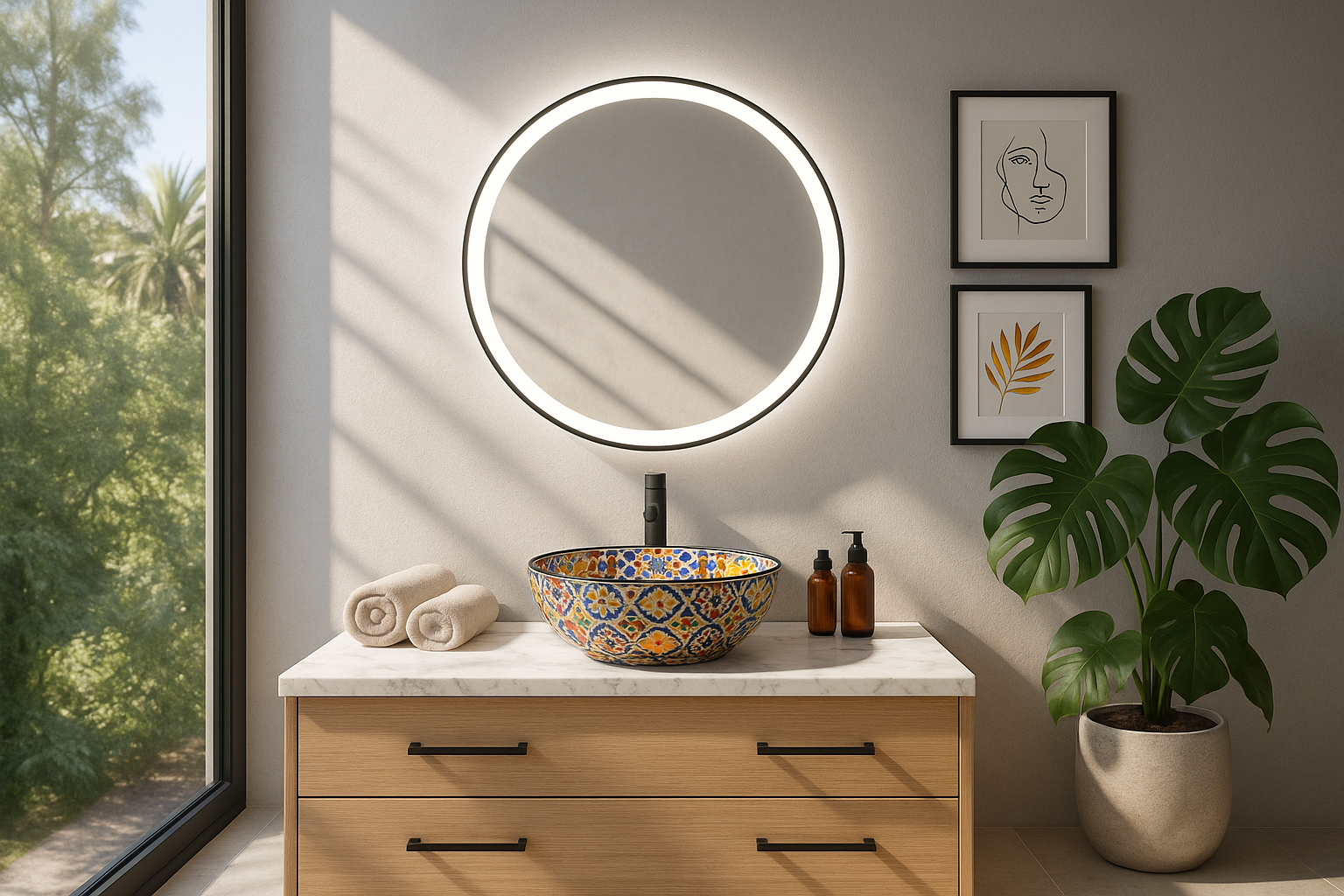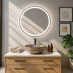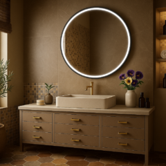 Okrągłe lustro z piaskowaniem 25mm na obwodzie, w subtelnej czarnej lub złotej ramie ze światłem LED, z pewnością podkreśli niepowtarzalny styl każdego wnętrza nadając mu wyjątkowego charakteru.