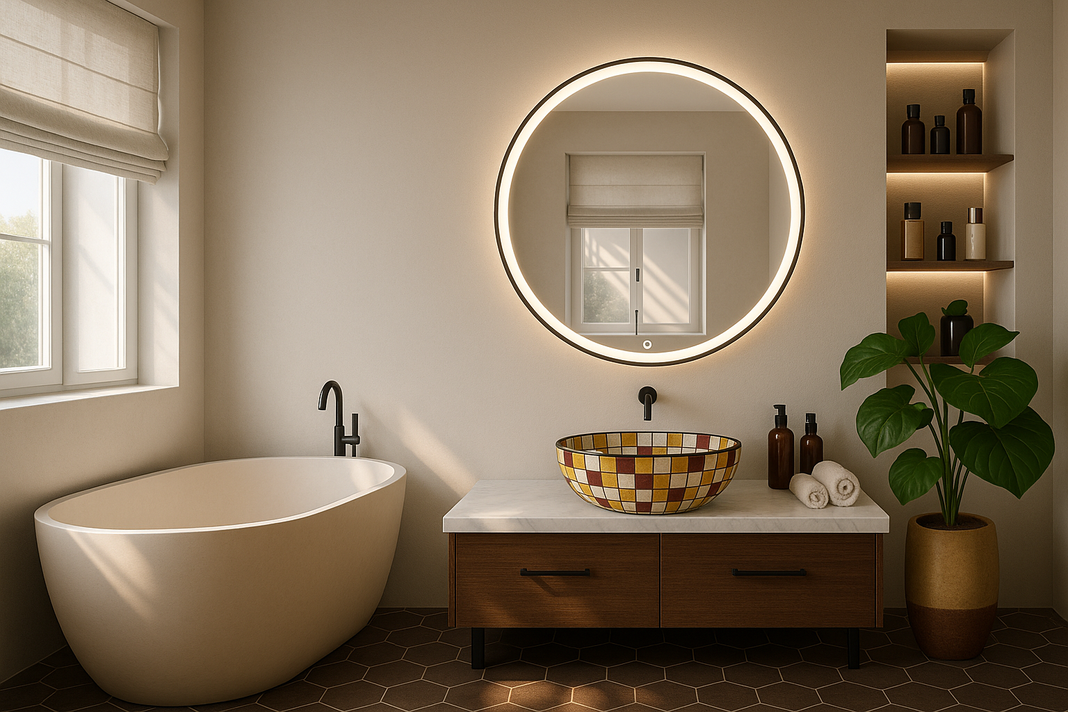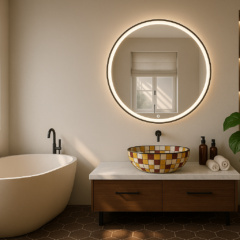 Der runde Spiegel mit 25 mm Sandstrahlung am Rand, in einem dezenten schwarzen oder goldenen Rahmen mit LED-Licht, betont sicherlich den einzigartigen Stil jedes Innenraums und verleiht ihm einen außergewöhnlichen Charakter.
