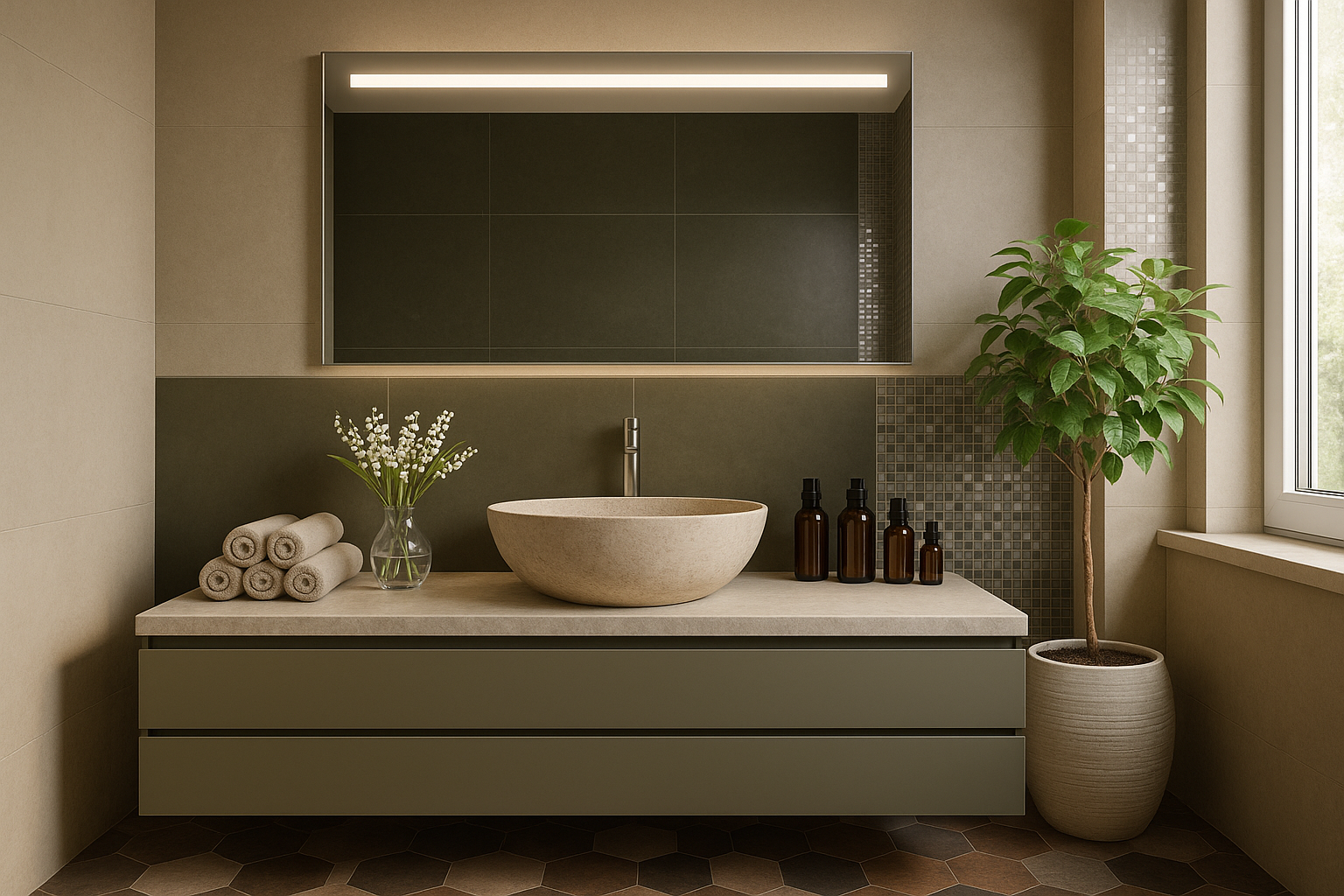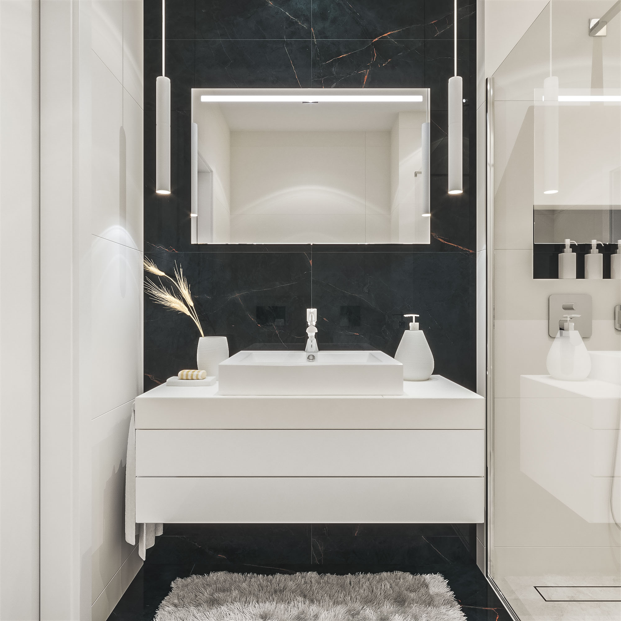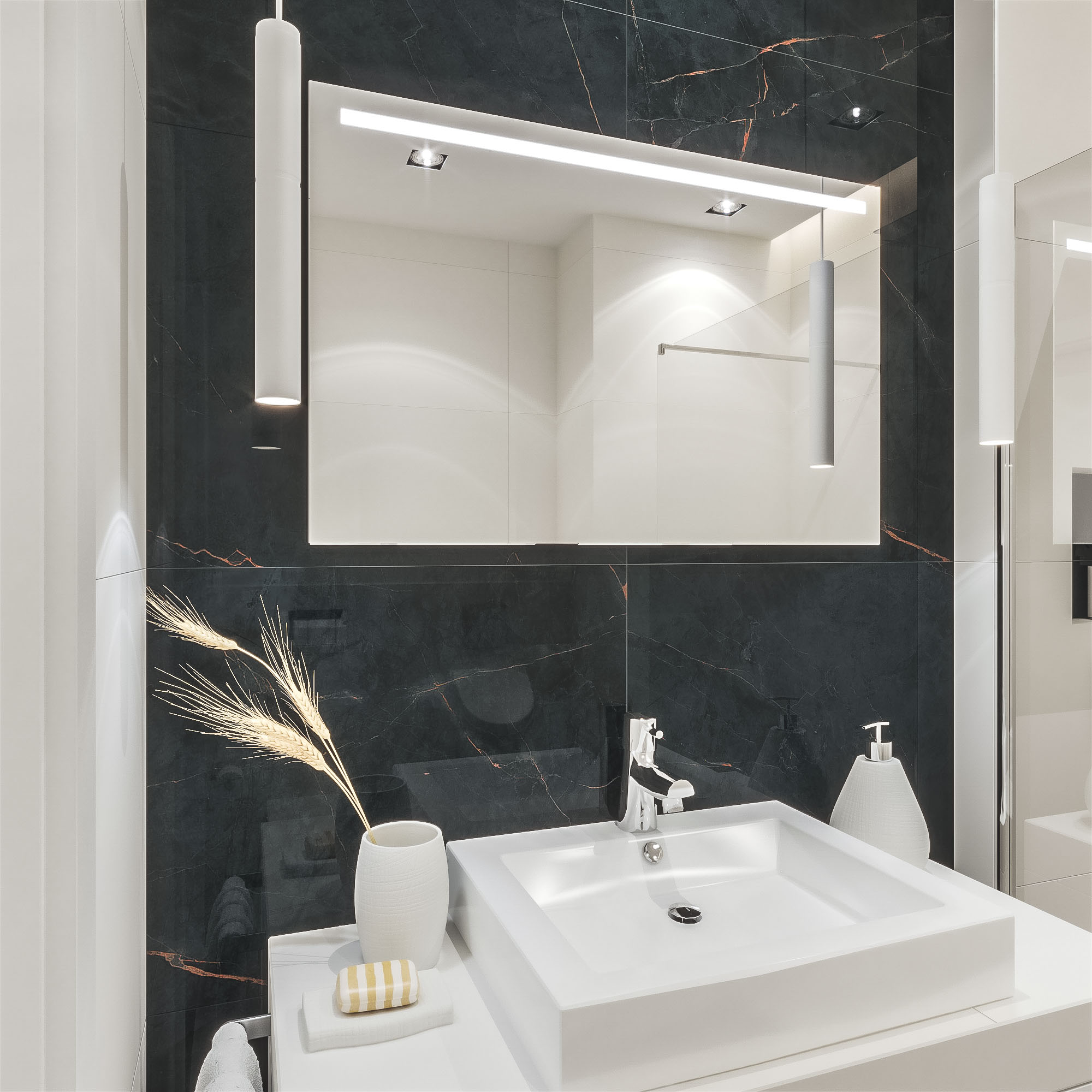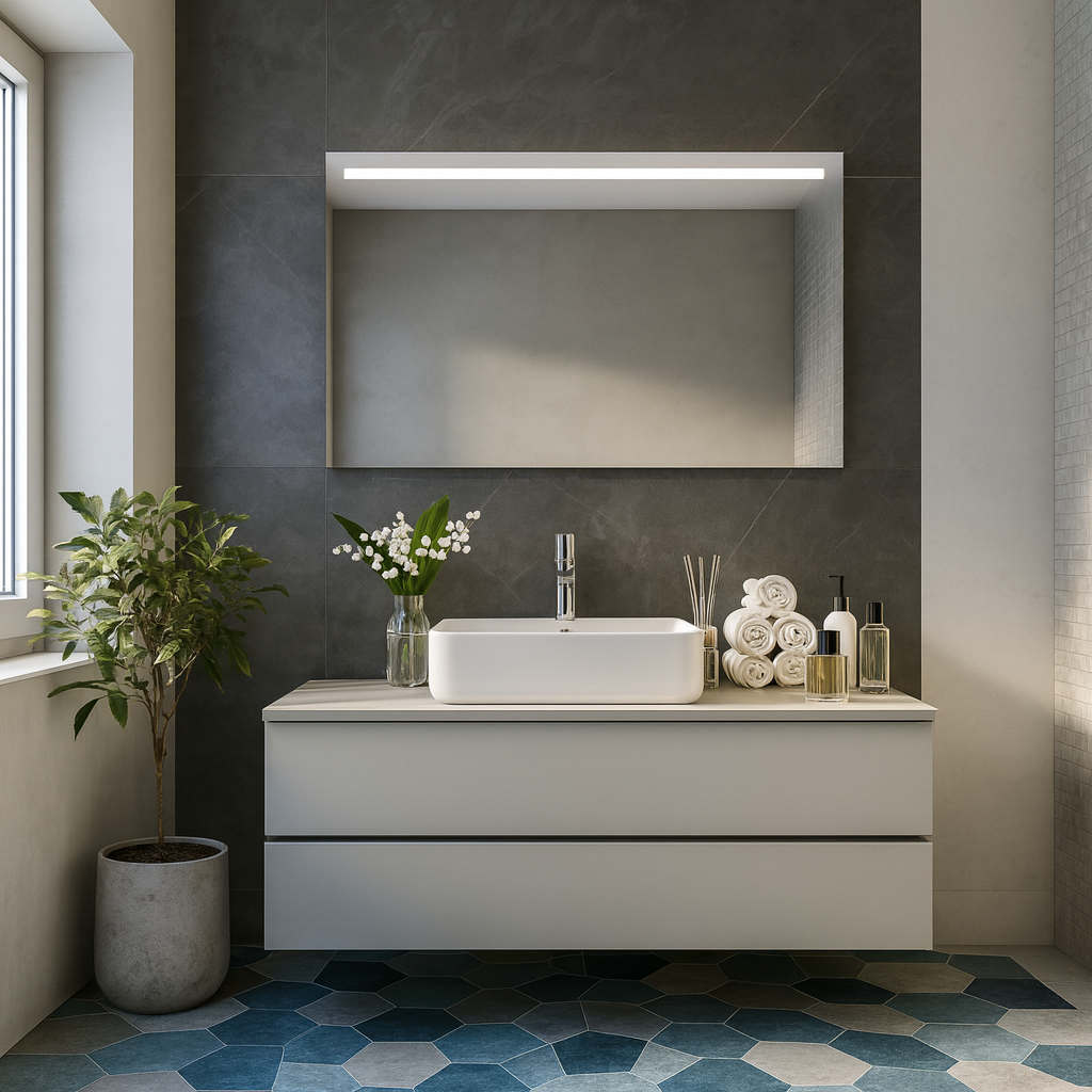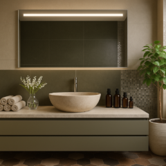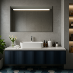 Zintegrowane oświetlenie LED subtelnie rozprasza światło, tworząc przyjemną, nastrojową atmosferę oraz zapewniając komfortowe warunki do codziennej pielęgnacji. Równomierne podświetlenie wydobywa naturalne kolory i detale, łącząc estetykę z funkcjonalnością.